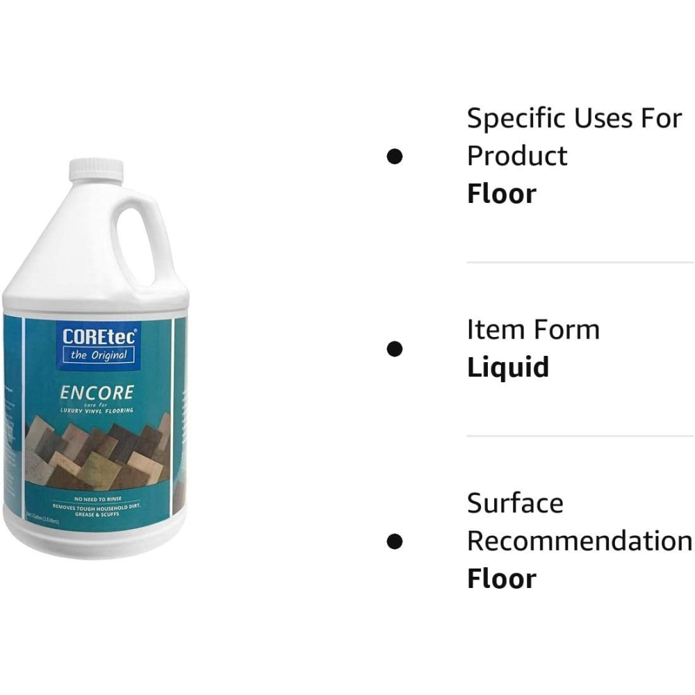 COREtec ENCORE by US Floors 03Z77 Floor Cleaner Care for Luxury Vinyl Flooring Refill 1 Gallon. No need to rinse. Removes Tough Household Dirt, Grease & Scuffs. Brightens and Preserves Finishes. Leaves no Sticky or Dulling Residue. Safe for all types of Ceramic, Hardwood, Laminate & Resilient Flooring. Encore Luxury Vinyl Cleaner is specially formulated for cleaning all types of hard surface flooring. It is ideal for removing dirt, grease and scuffs. This product is designed to be used full-strength as packaged. Do not dilute. No need to rinse. Coverage: Depends on how the product is applied. Approximate coverage is up to 2,000 sq. ft/quart.