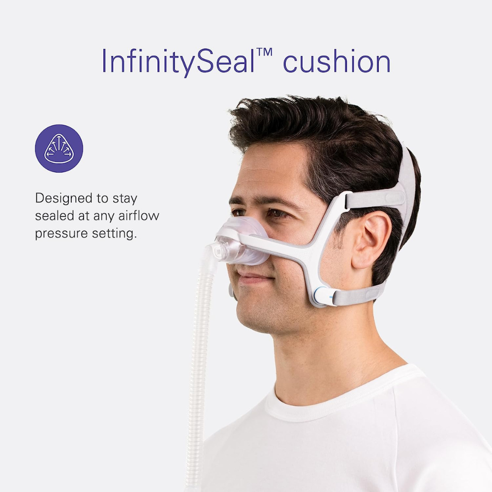 The InfinitySeal technology comes with an adaptive silicone that provides a comfortable seal on the user’s face. This allows the mask to flex during therapy without any leakage. The cushion design fits most facial structures. It also reduces pressure on the nasal bridge by using a thinner and softer material over the nose.